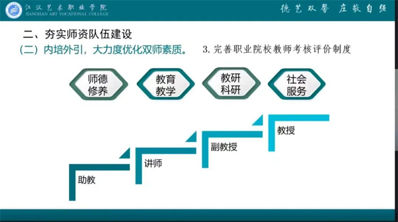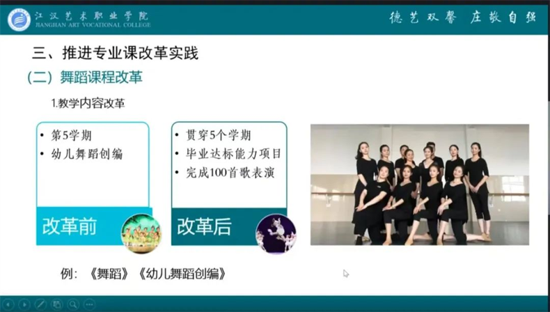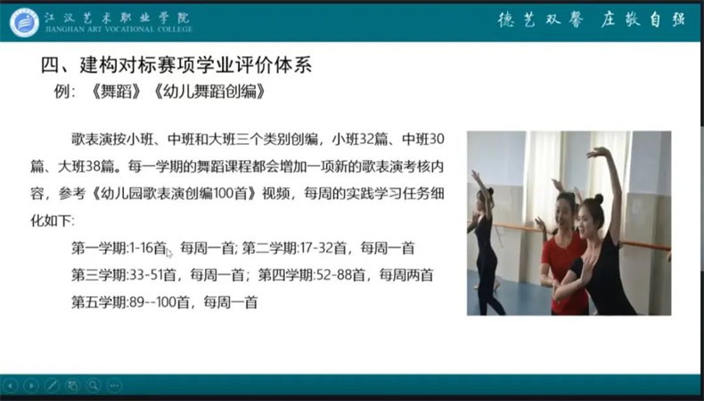 “从研赛和备赛的经历中,可以很直观的感受到,国赛已成为风向标,最终指向性是对专业的改革,对人才培养定位目标的调整,对课程教学内容、教学体系、教学模式的优化,教学方法以及教师团队的建设。”针对课赛,结合往年国赛选手视频,她认为应从以下四个方面进行专业改革,促进机制创新:一是健全国赛、省赛、校赛机制;二是夯实师资队伍;三是推进专业课改革实践;四是建构对标赛项学业评价体系。“道阻且长,行则将至。全国职业院校技能大赛不仅成为教学的指挥棒,更成为检验教学质量的标准,‘以赛促教、以赛促学、以赛促改、以赛促建’一直在路上,学前教育专业的教学改革一直在路上。”徐丽蓉希望和大家一起携手,交流协作,为学前教育高质量发展贡献一份力量。