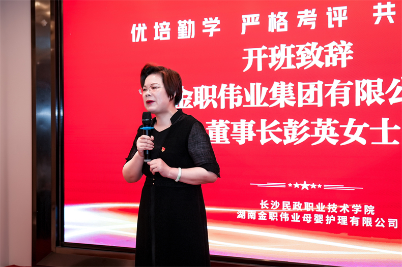 开班典礼伊始,金职伟业集团有限公司董事长彭英就“赋能三教改革,打造优秀的培训评价组织”“积极探索岗课赛证综合育人模式”“金职伟业家庭服务产业学院与全国婴幼儿照护产教融合共同体的打造”三方面,分享了金职伟业近年来的工作路径与成果。“金职伟业愿与在座的各位专家携手,共同深化婴幼儿照护高素质技能人才培养模式改革,为行业健康发展与职业教育改革体系建设贡献力量。”