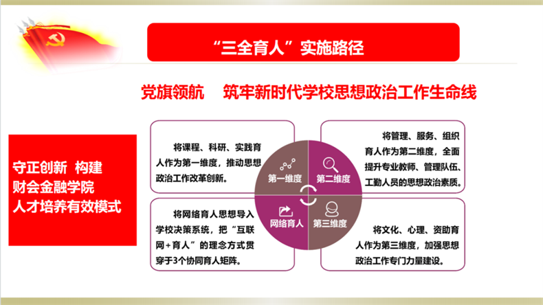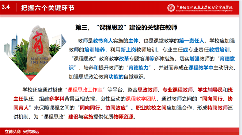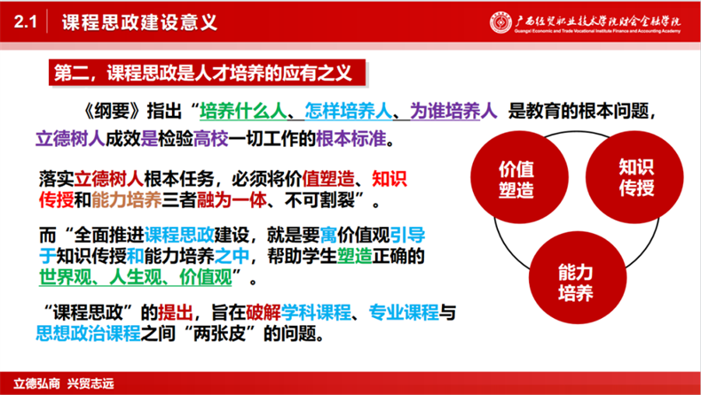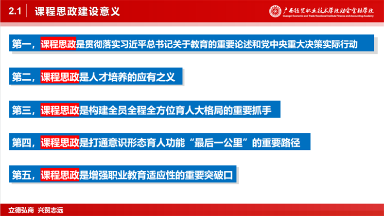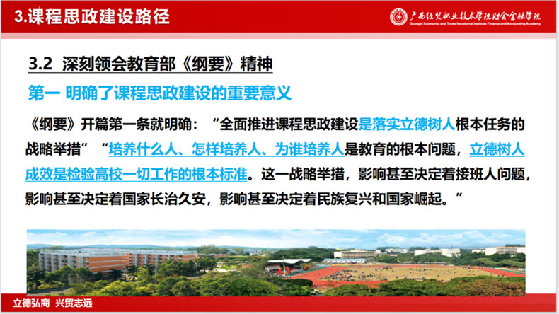 “《纲要》开篇指出,‘全面推进课程思政建设是落实立德树人根本任务的战略举措。’并强调,‘这一战略举措,不仅决定着接班人的问题,也影响着国家长治久安、民族复兴和国家崛起。’”她指出,课程思政是贯彻落实习近平总书记关于教育的重要论述和党中央重大决策的实际行动、人才培养的应有之义、构建全员全程全方位育人大格局的重要抓手、打通意识形态育人功能“最后一公里”的重要路径和增强职业教育适应性的重要突破口。