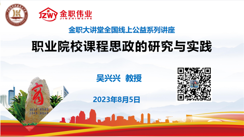 8月5日,金职大讲堂第86讲开讲,课程邀请到广西经贸职业技术学院吴兴兴教授作《职业院校课程思政的研究与实践》主题授课。