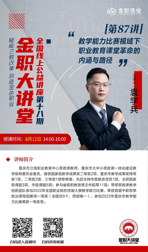 8月12 日,金职大讲堂将开启第十八期第87讲,课程将邀请重庆市立信职业教育中心袁学兵教授,进行《教学能力比赛视域下职业教育课堂革命的内涵与路径》主题授课。届时,诚邀各位行业专家、院校老师共同参与。