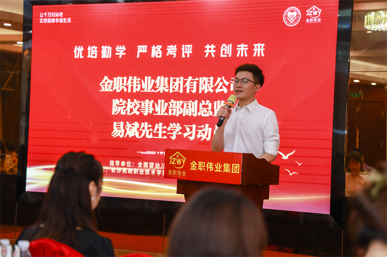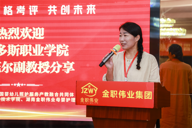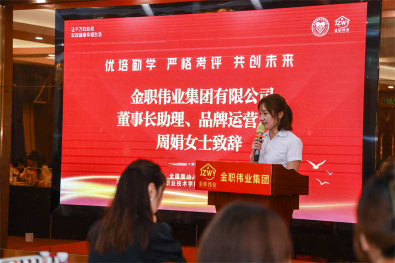 开班典礼伊始,金职伟业董事长助理兼品牌运营总监周娟以“紧跟职教好政策,深耕内涵建设”“积极构建产教融合共同体”“深化岗课赛证、产教融合,共育百万托育人才”为主题,分享了金职伟业在推进1+X证书制度试点工作开展、深化校企合作、赋能幼儿照护行业发展等方面的举措与成果。“今年,金职伟业将在全国多地举行幼儿照护主题论坛,与各地校企,行业专家深入交流,促进校企人才共育,也希望在座的各位专家老师积极参与,共同推动幼儿照护行业高质量发展。”
