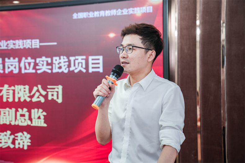 结业典礼伊始,金职伟业院校事业部副总监易斌对老师们顺利完成岗位实践任务表示祝贺,他希望各位参训老师能扎实推进实践成果转化,将其应用到实际教育教学中,不断提升自身专业能力和教学水平,为技术技能人才成长成才贡献力量。他期望今后能与各院校、老师保持常态化交流,实现校企之间的长效互动、协同发展、合作共赢。