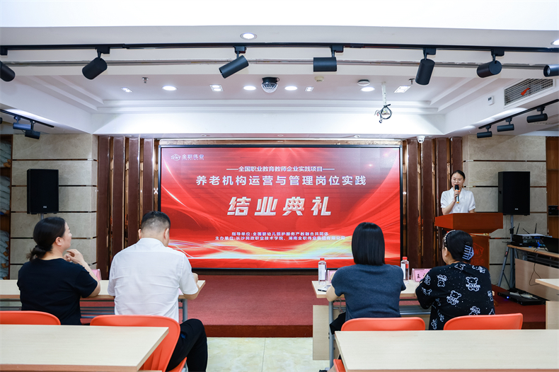 8月29日,为期35天的全国职业教育教师企业实践项目——养老机构运营与管理岗位实践项目圆满结业,金职伟业集团有限公司总经理潘建明、乐来龄红花坡老年养护院院长熊妹出席结业典礼,并对参训老师圆满完成实践任务表示祝贺。