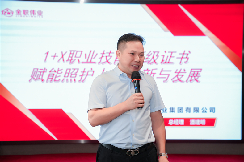 结业典礼最后,金职伟业总经理潘建明以“1+X职业技能等级证书赋能照护人才创新与发展”为主题作分享,他简要介绍了金职伟业围绕教育部现代职业教育体系建设改革重点任务,在深化“岗课赛证”融通等方面所做的探索与努力。“金职伟业愿与各试点院校在产教融合共同体打造、产教融合实践中心建设、教学资源库建设、虚拟仿真实训基地建设、核心课程打造、教材资源开发、教师企业实践项目开展等方面深入合作,为人才培养工作提质与职业教育高质量发展做出新的贡献。”
