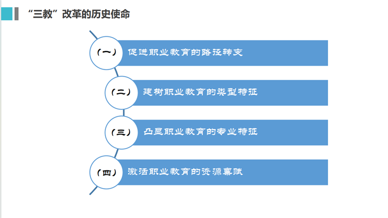 课程最后,陈晓燕提到,推进“三教”改革,巩固改革成果,职业院校还需建立科学的教学评价与反馈机制,不仅要创新教师评价机制、还需在教材与教法上发力,建立教材选编与监管机制,并完善教法评价机制。