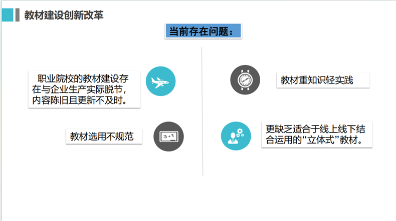 教材,是教学内容的支撑和依据,是实施课程改革的重要载体。加快教材改革与创新,是更新教学内容,推进教学改革、提高人才培养质量的重要措施。陈晓燕提到,职业院校的教材建设存在与企业生产实际脱节,内容陈旧且更新不及时,重知识轻实践等情况。她建议道,职业院校要积极与企业交流合作,与企业共同进行教材研发,并根据教材特点选择不同的呈现形式。