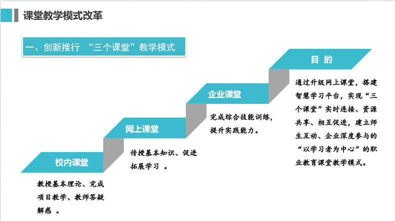 针对教法改革,陈晓燕认为,职业院校发展需改革传统的普通教育课堂教学模式,推行面向企业真实生产环境的任务式教学模式,广泛采用项目式、情景式教学。她还分享了三点具体措施:一是创新推行校内、网上与企业三个课堂教学模式,借助网上课堂学习平台,建立师生互动、企业深度参与的“以学习者为中心”的职业教育课堂教学模式;二是借鉴德国“双元制”职业教育的经验,开展学徒制培养,满足跟岗实训、“3+2”工学交替和顶岗学习的需要;三是与行业领军企业合作建立企业冠名的学院或产学研基地等,构建与企业业务经营周期相适应的校内课堂与企业课程交替教学模式。