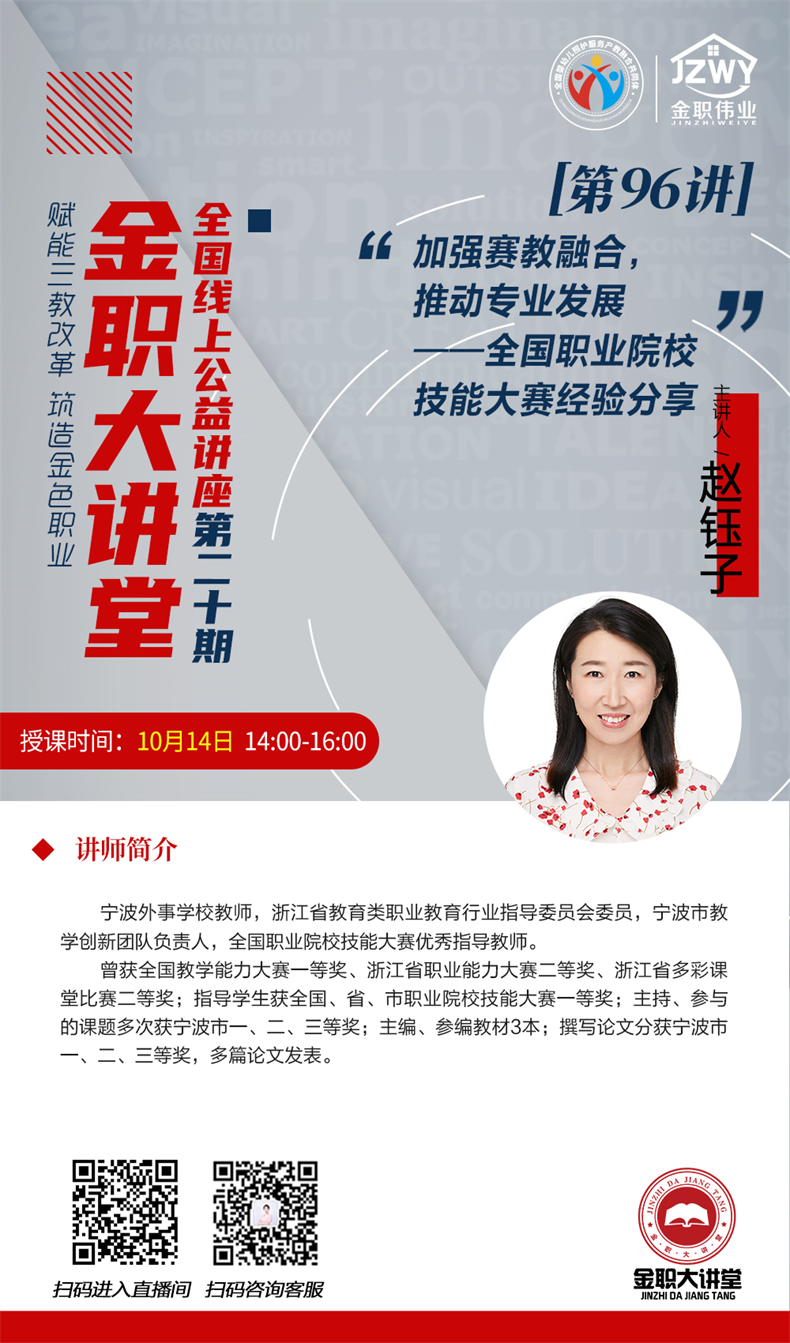 10月14日,金职大讲堂将开启第二十期第96讲,课程将邀请宁波外事学校教师赵钰子,进行《加强赛教融合,推动专业发展——全国职业院校技能大赛经验分享》主题授课。届时,诚邀各位行业专家、院校老师共同参与。