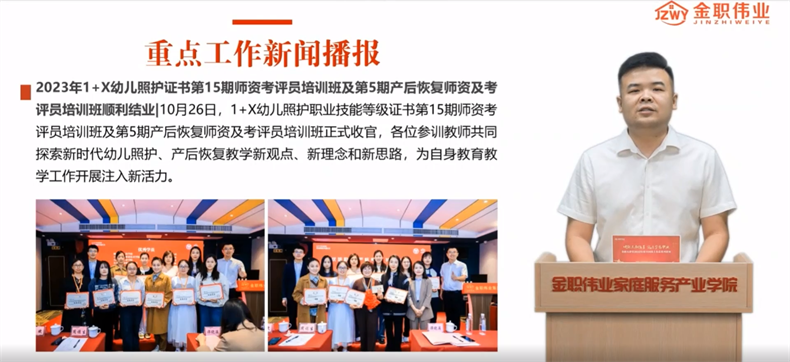 最后,张平芳谈到,推进“岗课赛证”与1+X”证书制度融通,促进人才培养,需要政校企行携手,共同发力。一是推进课证融合教学,将证书融入课程,构建专业课程融通体系,实现专业与职业并进;二是推进课岗融合教学,学校和企业共同制订培养方案,根据岗位需求重新整合专业课程内容,将课程内容与岗位需求进行匹配,进行模块化教学;三是实现课赛对接与证赛对接教学,加强“X”证书教学资源的建设,教师方面,注重“1+X”证书制度的教师队伍建设与改革,教材方面,紧跟产业升级变化,借助“互联网+”“智能+”等手段,建立电子化的教学资源库,编写活页教材,教法方面,采用模块化、分工协同的教学方式,或运用理论与实践有效结合的教法。11月11日,金职大讲堂将开启第二十一期第100讲,课程将邀请齐鲁师范学院学前教育学院教授宫盛花,进行《基于ITERS-3评估提升婴幼儿教育质量》主题授课。届时,诚邀各位行业专家、院校老师共同参与。