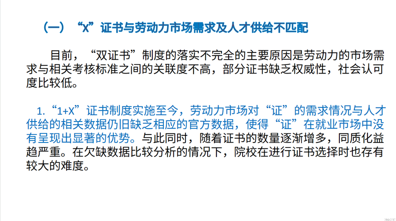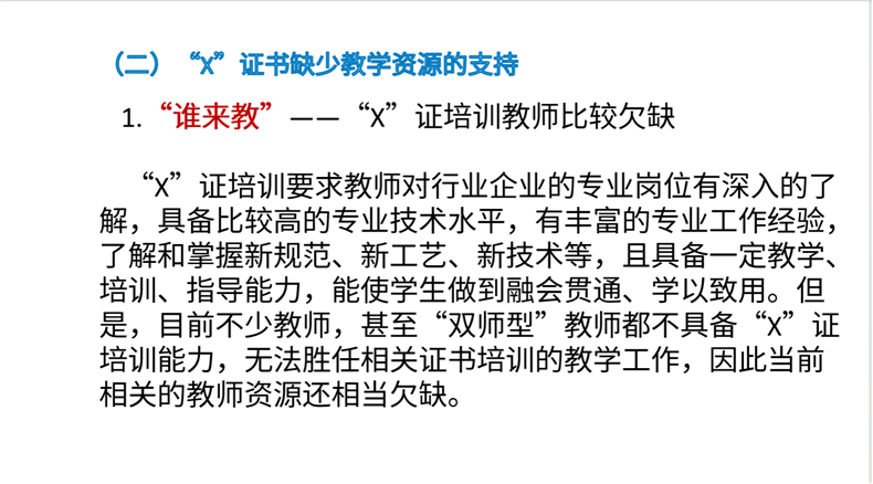 就当下“岗课赛证”与"1+X”证书制度融通发展,张平芳认为,两者之间的融通还存在一定困境,首先,“X”证书与劳动力市场需求及人才供给存在不匹配的问题,劳动力市场对“证”的需求情况与人才供给的相关数据仍缺乏相应的官方数据,使得“证”在就业市场中没有呈现出显著的优势。其次,一些培训机构制定的规范欠缺公信力,相关的龙头企业参与证书开发的力度不足也使得开发出的“X”证书受到质疑;另外,“X”证书还缺少教学资源的支持,存在教师资源匮乏,培训内容不完善,培训方式有待提高等问题。