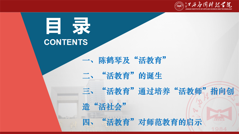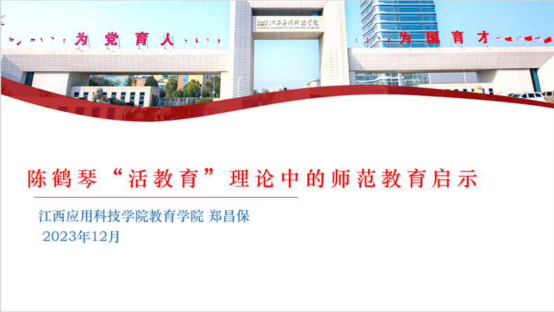 12月02日,金职大讲堂第103讲开讲,课程邀请到江西应用科技学院教育学院院长郑昌保副教授作《陈鹤琴“活教育”理论中的师范教育启示》主题授课。