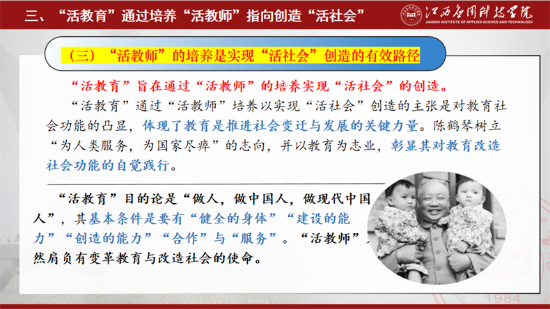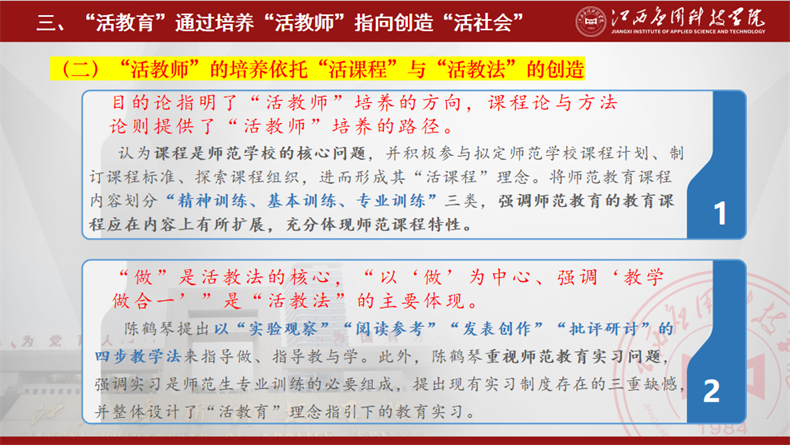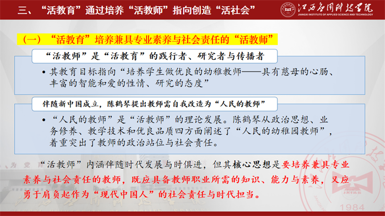 郑昌保提到,“教育是推进社会变迁与发展的关键力量,通过培养‘活教师’指向创造‘活社会’是教育社会功能的体现”。“活教师”即兼具专业素养与社会责任的教师,培育“活教师”的关键在于两点,一是要增强师范教育内容与特性,二是要重视教学实践。从教师培养制度改革、教师队伍建设等多方面提升教师教学能力发挥教育的社会功能,培育具有创造性、建设性、社会责任感的高质量人才,使之积极参与社会改造,推动社会的进一步发展。