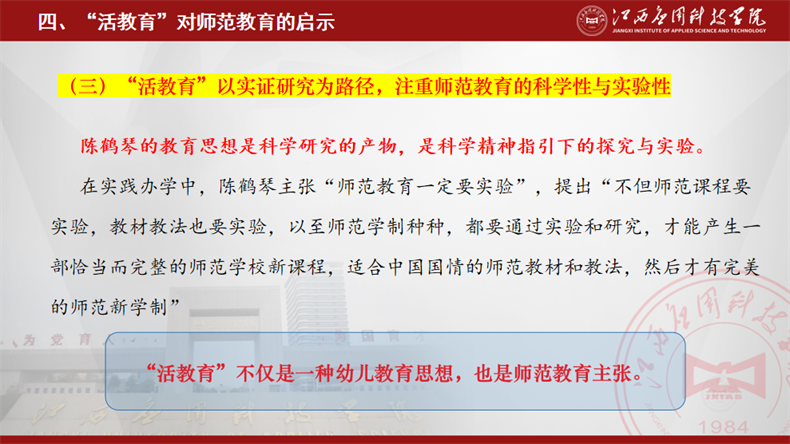 课上,郑昌保从“活教育”的内容、诞生、现实应用、对师范教育的启示四方面展开讲解。“活教育”是由中国现代幼儿教育的奠基人陈鹤琴于1940年提出并开启实验,是陈鹤琴基于个人求学经历及教学实践的基础上对传统幼儿教育弊端和现代幼儿教育革新的思考。