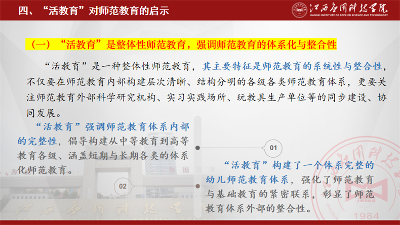 在课上,郑昌保就“活教育”对师范教育的启示做了详细的讲解。“活教育”是要创造注重整体性、革新性、实践性的师范教育。现代师范教育应构建清晰的各级各类师范教育体系,并注重同教研机构、企业协同发展;在现有师范教育的基础上接轨国际,取长补短,不断革新进步;“活教育”注重实践,并通过实验及研究提升其科学性,这使它适用于幼儿师范教育的同时,也适用于师范教育。“师范教育的革新需要立足于我国本土教育,广泛地向外界学习,注重科学实验的重要性,建立适合的师范教育体系和规范”