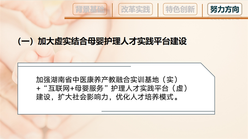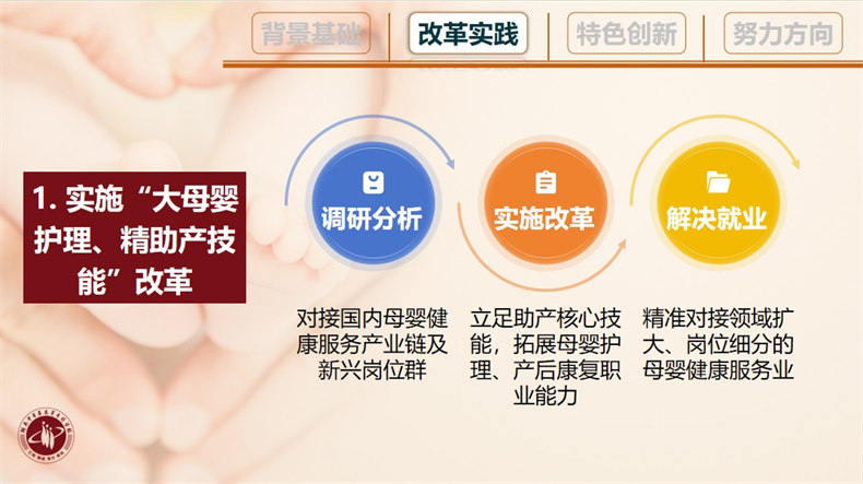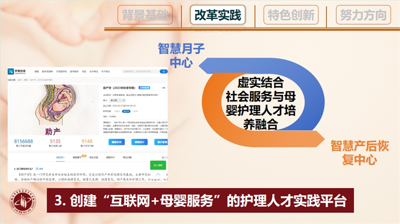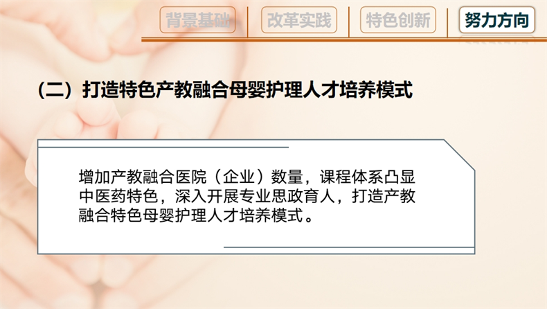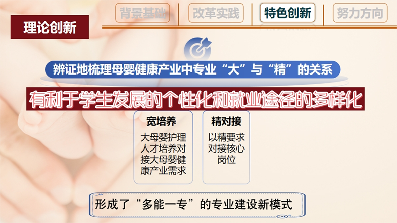 《2021-2030年中国妇女儿童发展纲要的实施方案》中提到:要将妇女儿童健康教育与健康促进贯穿于生命周期;拓展“互联网+妇幼健康”服务,大力开展线上健康宣教和咨询指导;以健康为中心,充分发挥中医药在妇女儿童医疗保健服务中的作用。“传统专业人才培养存在着不适应产业发展需求、培养出不来高素质技能型人才、专业建设滞后于产业发展问题,学校抓住改革机遇,勇于变革,致力于打造有特色的产教融合母婴护理人才培养模式。”向罗珺说道。