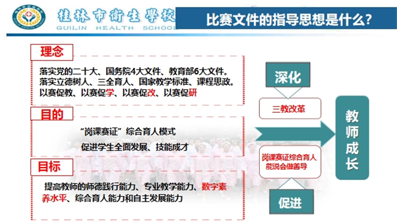 陈小博首先介绍了全国职业院校技能大赛教学能力的目的与目标。“大赛紧紧围绕着‘岗课赛证’综合育人、培养‘双师型’教师展开,目的是为提高教师的师德践行能力、专业教学能力、数字素养水平、综合育人能力和自主发展能力,推动“岗课赛证”综合育人,促进学生全面发展、技能成才。”
