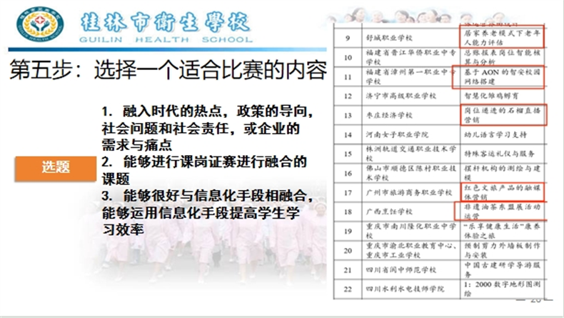 随后,她详细介绍了备赛的流程与步骤要点。在赛事团队组建方面,成员之间要要优势互补,各取所长,发挥团队合作的最大效度;在课程选择方面,从成员擅长的课程中选择更贴合赛事要求的课程;在比赛选题方面,选择便于融入时代热点、课岗证赛、信息化手段的课题与内容;观看历年获奖视频,吸取经验,少走弯路,反复尝试求创新。