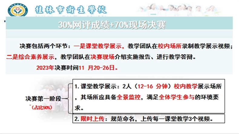 决赛包括两个环节。一是课堂教学展示,教学团队在校内场所录制教学展示视频;二是综合素养展示,教学团队在决赛现场介绍实施报告的主要内容、创新特色,并进行教学答辩。“广泛搜集评委现场提问的素材,准备足够的佐证材料及PPT展示内容,确保答辩现场能够清晰准确地表达,展现出最好的效果。”课程最后,陈小博给出了她对参赛团队参加答辩环节的建议。