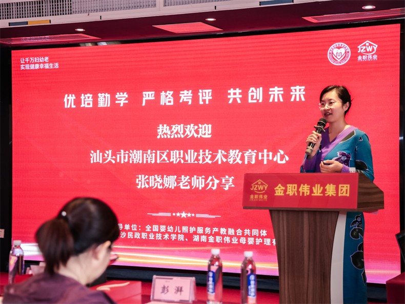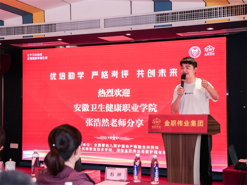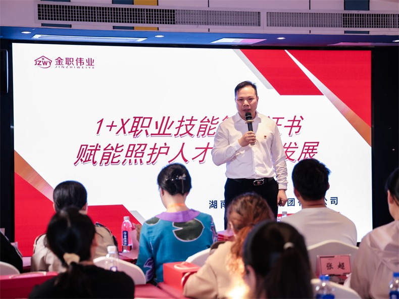 典礼最后,金职伟业总经理潘建明以《1+X职业技能等级证书赋能照护人才高质量发展》为主题,总结并介绍了金职伟业围绕教育部职业教育改革十一项重点任务展开的工作规划与工作成效。他期待更多的专家教师参与到教师企业实践基地、金砖赛项、全国婴幼儿照护服务行业产教融合共同体的建设中,与金职伟业携手开拓更为广阔的合作空间。