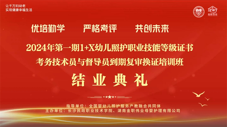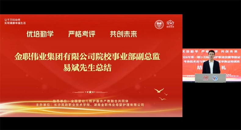 典礼最后,金职伟业院校事业部副总监易斌作总结讲话。“1+X幼儿照护职业技能等级证书的含金量承载着婴幼儿照护行业的高质量发展,1+X产后恢复职业技能等级证书的含金量则承载着产后妈妈的健康与幸福,两个行业都与人口长期均衡发展息息相关,同样也关系到民生福祉。期望各位专家老师带着新的责任与担当重新启程,为1+X幼儿照护、产后恢复职业技能等级证书全面落地保驾护航。”他表示,金职伟业将始终秉承贴心、专业、创新、感恩的服务理念,全面助力各试点院校工作开展,为幼儿照护、产后恢复人才培养贡献力量。