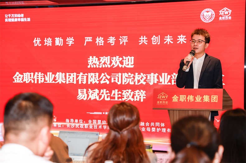 4月25日,2024年第二期1+X幼儿照护职业技能等级证书考评员到期复审换证培训班在长沙举行开班典礼。金职伟业院校事业部副总监易斌出席典礼。