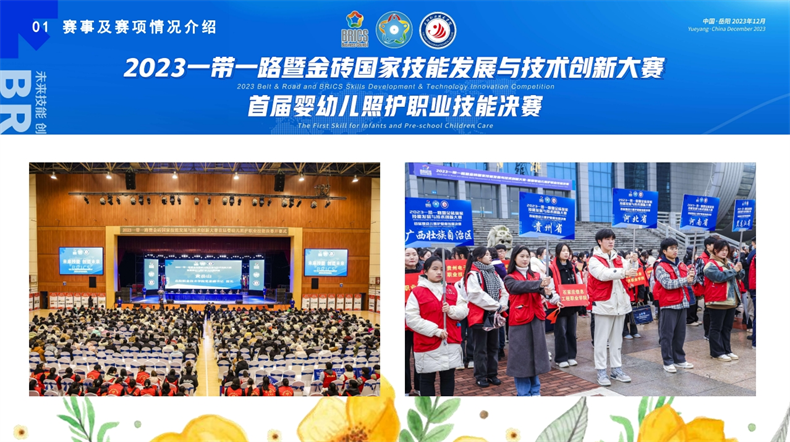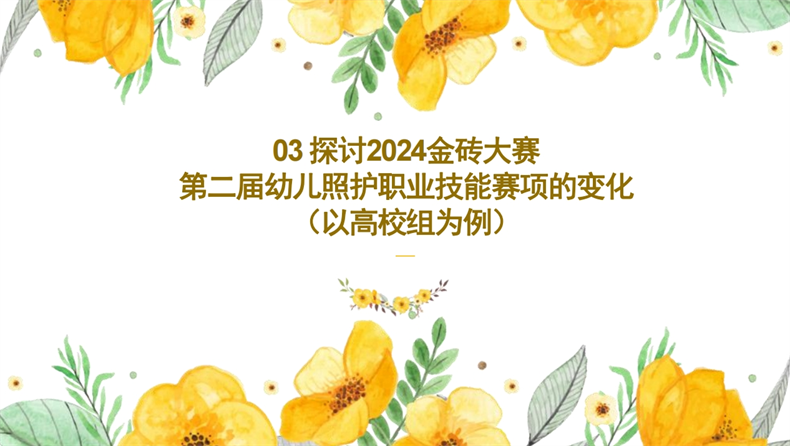 最后,丁扬老师以高校组为例,围绕赛项名称、参赛方式、考核内容,与大家探讨了2024一带一路暨金砖国家技能发展与技术创新大赛第二届幼儿照护职业技能赛项的变化。