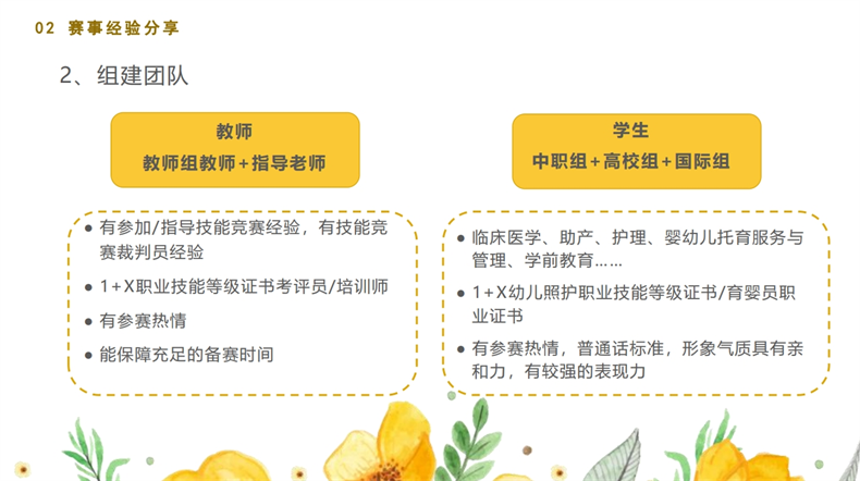 课上,丁扬老师介绍了2023一带一路暨金砖国家技能发展与技术创新大赛首届婴幼儿照护职业技能赛项,并分别从选择组别、组建团队、研究赛事规则、解析比赛常见问题等方面作赛事经验分享。