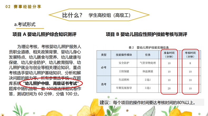 竞赛项目包括:项目 A 婴幼儿照护综合知识测评,即理论考核;项目 B 婴幼儿回应性照护技能考核与测评,即实操考核。