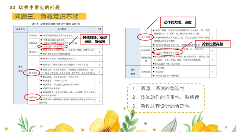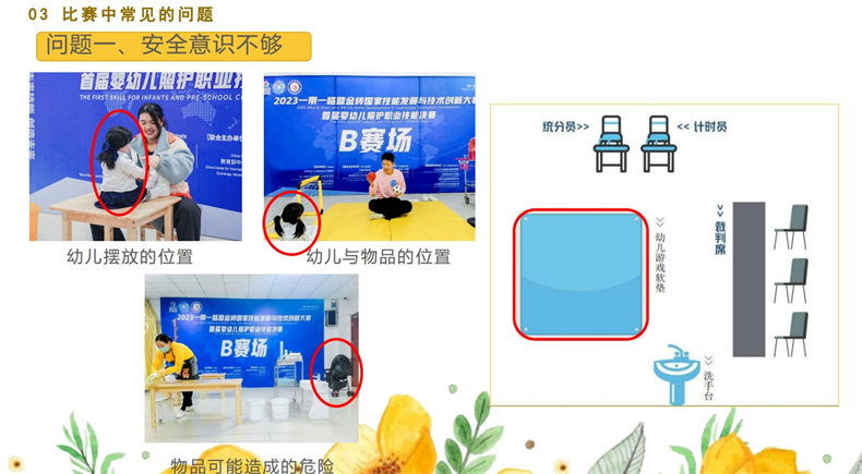 丁扬老师分别从安全意识、卫生意识、急救意识、人文关怀、专业度等方面具体分析了比赛过程中常见的问题及注意事项,提醒参赛选手要注意细节避免失分,拿到高分;她还建议想在婴幼儿回应性照护技能考核与测评中拿高分的参赛选手,每个项目的操作时间要达到考核时间的80%以上。