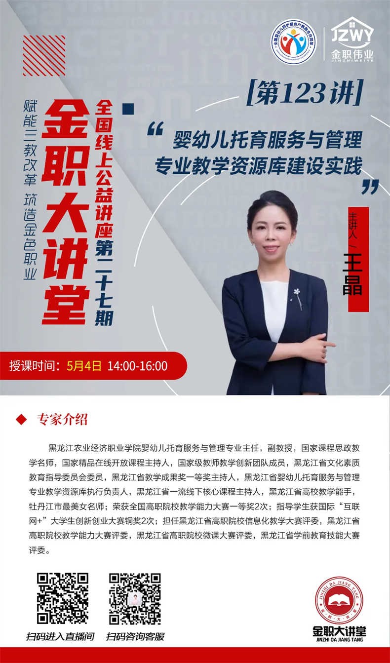 5月4日,金职大讲堂将开启第二十七期第123讲,课程将邀请黑龙江农业经济职业学院婴幼儿托育服务与管理专业主任、副教授王晶,进行《婴幼儿托育服务与管理专业教学资源库建设实践》主题授课,诚邀各位行业专家、院校老师共同参与。