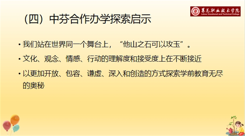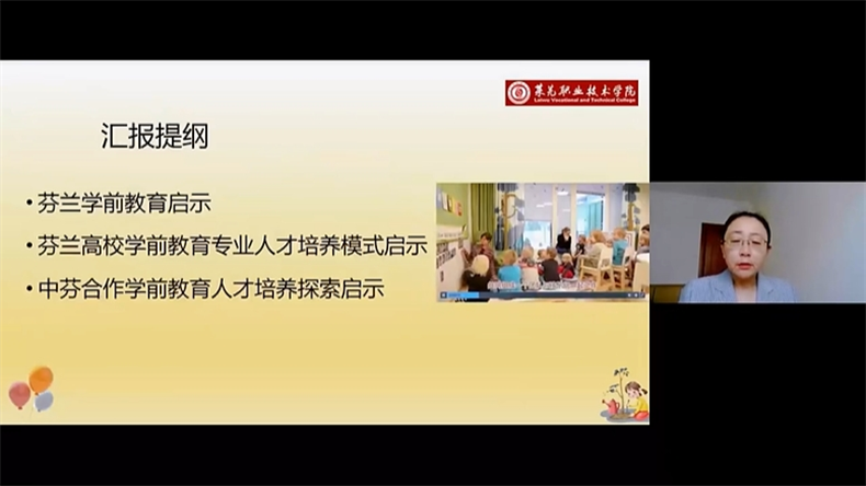 课上,周晶教授从芬兰学前教育特点、政策支持与专业人才培养模式,莱芜职业技术学院在中芬合作学前教育专业建设方面的实践分享教育教学启示。