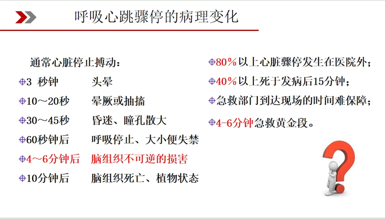 “现场心肺复苏是指心跳、呼吸骤停的现场急救,通常采用人工胸外按压和口对口人工呼吸法。在心脏骤停后的‘4~6分钟’被称为心肺复苏的黄金时间,超过6分钟后就会造成不可逆的脑损伤,且抢救成功的几率会变得非常小。”邢涛教授简要阐述了心肺复苏的适用情境与重要性。