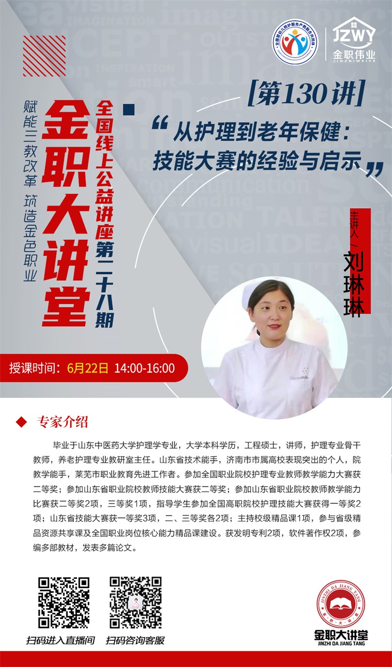 6月22日,金职大讲堂将开启第二十八期第130讲,课程将邀请莱芜职业技术学院刘琳琳老师,进行《从护理到老年保健:技能大赛的经验与启示》主题授课。