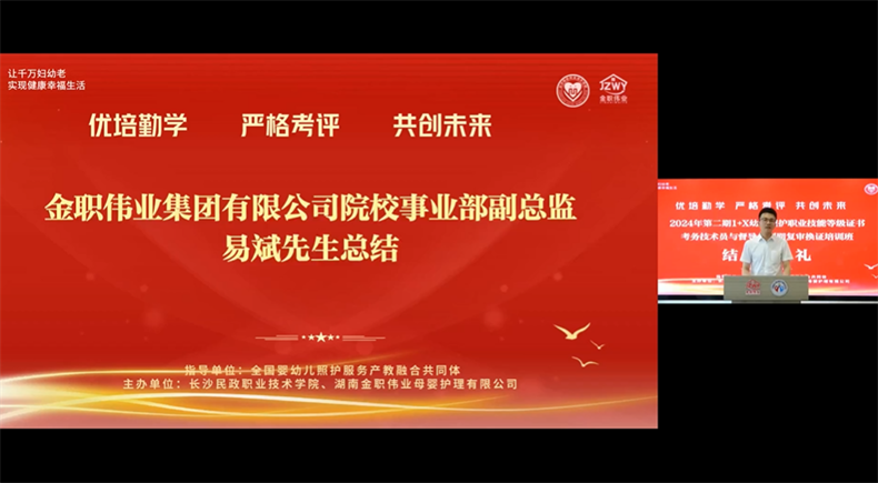 最后,金职伟业院校事业部副总监易斌对顺利完成各项培训任务并圆满结业的参训教师表示热烈祝贺,“幼儿照护证书承载着婴幼儿照护行业的高质量发展,产后恢复证书则承载着产后妈妈的健康,两张证书的质量与我国的人口长期均衡发展息息相关,同样也关系着民生福祉。希望各位老师带着责任与担当重新启程,全力推动学校考评工作开展,赋能新时代技术技能人才培养。”