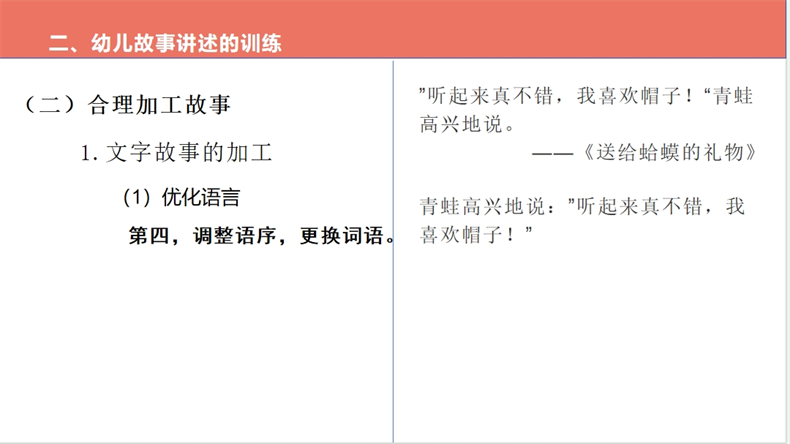 刘立华教授谈到,从表现形式划分,故事分为文字故事与图画故事。在对故事进行合理加工时,也要根据故事类型的不同采用不同的加工方式。文字故事可以从故事语言、故事情节、故事首尾上进行合理的优化设计。图画故事则可以根据故事主题,合理调整图画结构;围绕故事情节,进行适当的图画补充;创设丰富的情境,丰富幼儿体验;增加回忆性设问、分析性设问、联系性设问等有效提问,帮助幼儿厘清思路、拓展思维、整合与迁移经验,促进幼儿的理解。