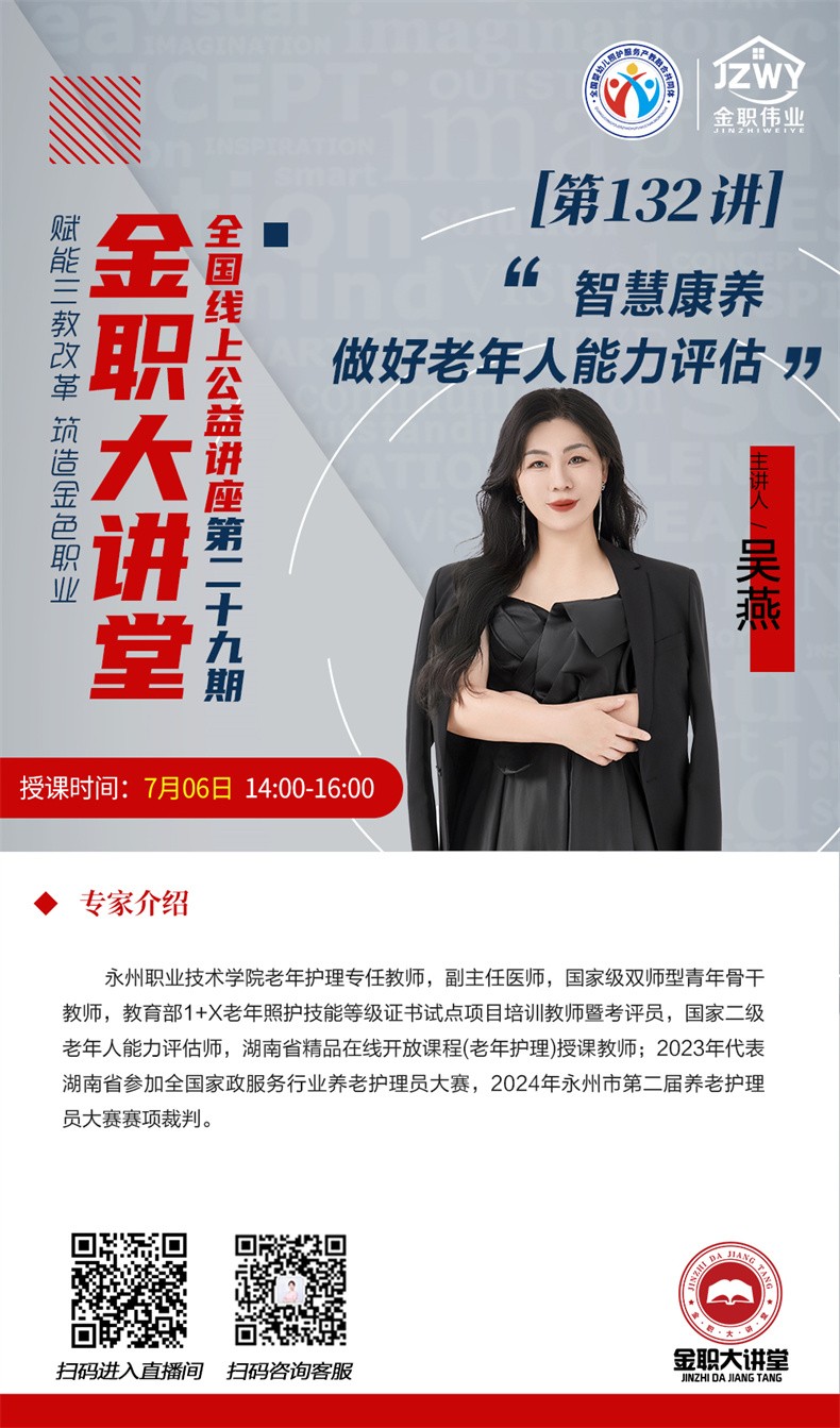 7月6日,金职大讲堂将开启第二十九期第132讲,课程将邀请永州职业技术学院吴燕老师,进行《智慧康养,做好老年人能力评估》主题授课。