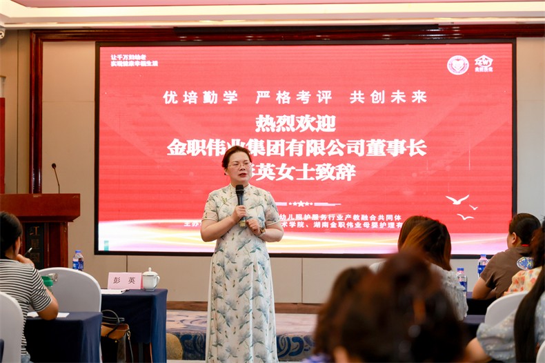 7月24日,2024年第四期1+X幼儿照护职业技能等级证书考评员到期复审换证培训班在长沙正式启动,金职伟业集团有限公司董事长彭英以及来自全国各地的35名职业院校教师共同参与了开班典礼。