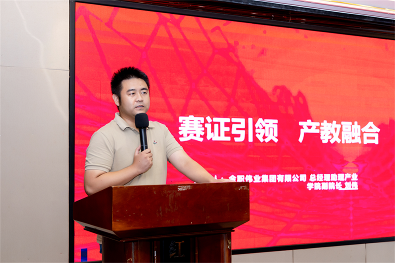 典礼最后,金职伟业总经理助理刘伟作总结发言。刘伟提到,金职伟业致力于产教融合和社会服务的深化,通过提升教育资源的质量和办学水平,开展多层次、多领域的合作项目。重点推进1+X证书制度的升级和师资培训体系的建立,加大虚拟仿真、教材研发和资源库建设等方面的投入;深化产教融合,为职业教育人才提供就业创业指导,拓展社会服务范围,以赛促教、以赛促学,共建产业学院;强化实体运营和标准化建设,探索国际化路径,引入海外先进标准和人才。金职伟业希望通过继续加强校企合作,实现与职业院校的资源共享和互利共赢,共同培养更多具有实际操作能力和创新能力的人才,促进教育质量和经济社会发展的全面提升。