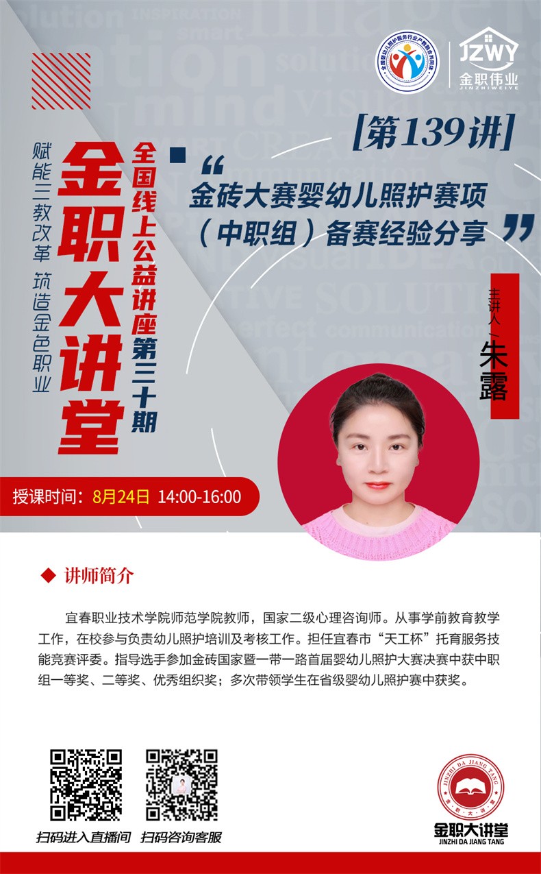 8月24日,金职大讲堂将开启第三十期第139讲,课程将邀请宜春职业技术学院朱露老师,进行《金砖大赛婴幼儿照护赛项(中职组)备赛经验分享》主题授课。