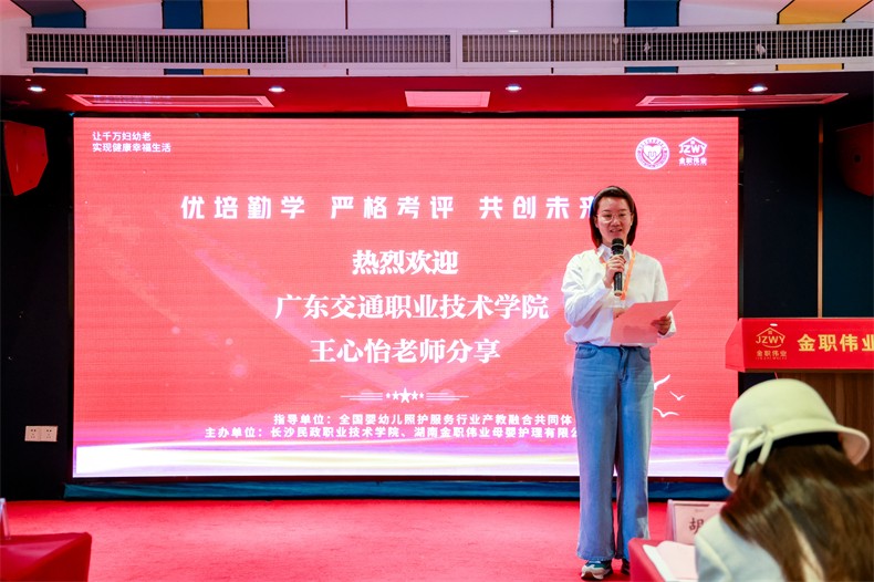 作为优秀学员代表,广东交通职业技术学院王心怡老师分享了学习心得。她衷心感谢金职伟业集团的精心组织与老师们的悉心指导,并表示本次培训让她作为一名音乐专业教师,得以系统掌握幼儿照护知识,了解学习幼儿照护技能的重要性。她深感此次培训帮助她迈出了教师自我转型的关键一步,增强了她为行业进步贡献力量的决心。