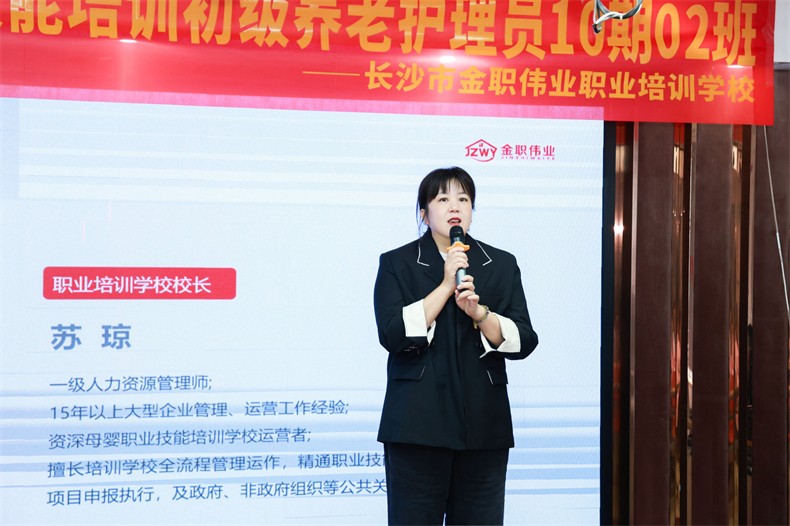 苏琼对学员的到来表示热烈欢迎,她提到,近年来,金职伟业在国家政策的号召引领下,积极与永州、娄底、郴州等市共同开展养老服务行业人才培训;在湖南省妇联的指导下,多次组织承办养老护理员、育婴师等多项家政服务从业人员技能大赛,在大赛中遴选出了一批批优秀的养老护理员、具有大国工匠精神的家政服务人员,为社会发展提供了充足的人才支撑。她希望,学员们把握此次培训学习机会,在十天的培训中,掌握学习方法,学好理论知识,练好扎实技能,在养老服务行业立足深耕。