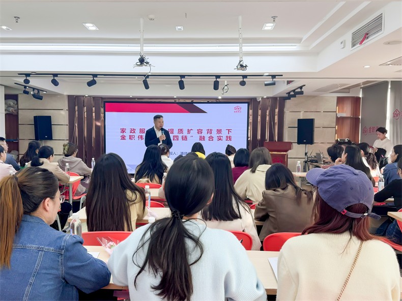 金职伟业集团总经理潘建明对培训班全体学员的到来表示热烈欢迎,并介绍了家政服务业提质扩容背景下金职伟业的发展历程,分享了金职伟业深化产教融合,推进家政服务业“教育链、人才链、产业链、创新链”融合的实践探索。最后,他对全体参训成员表示了诚挚的敬意,“苔花如米小,也学牡丹开,正是因为有这么多心怀大爱的特教人,才让特殊的孩子拥有了特殊的爱,而技能则让他们每一个人都有人生出彩的机会。”