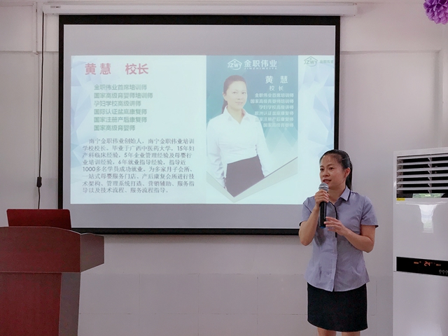南宁金职伟业培训学校校长黄慧女士出席开班典礼并致辞,她为看到这么多行业精英选择母婴行业感到高兴,她希望学员们能够坚定母婴行业的道路,同时她也表示南宁金职伟业永远是学员们坚强的后盾。