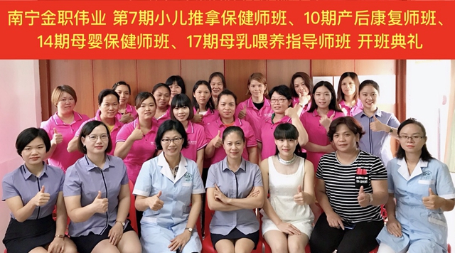 8月7日,南宁金职伟业职业培训学校第7期小儿推拿保健师班、第10期产后康复师班、第14期母婴保健师班、第17期母乳喂养指导师班开班典礼隆重举行。