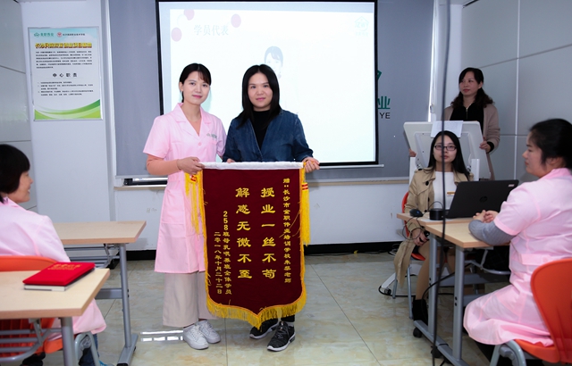 为感谢朱黎老师对学员们的辛勤付出,班长李必还代表全班同学送上一面锦旗给老师。此次结业仪式在师生们的拥抱、姐妹们的寒暄中圆满落幕。