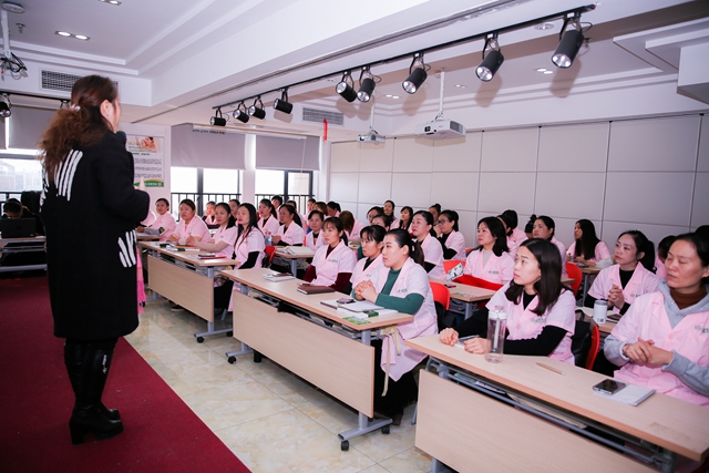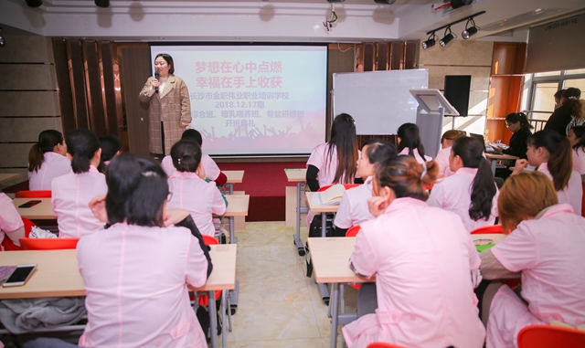“首先欢迎与恭喜你们进入这个行业的至高点。很多同行认为产后康复就是中医推拿,无非就是机器+产品。他们不知道有康复理疗师,不知道物理治疗法,不知道我们金职伟业在优化并运用到我们日常教学里、运用到我们的门店服务中。我们的催乳师、母婴综合技能、骨盆研修班等在课程设置上都将这些优化与中医推拿完美涵盖进去,这也是我们整个课程的优势,期待大家的整体学习效果,希望大家都能走进这个行业、平台去发展,走向技术的至高点。同时预祝大家愉快学习,愉快相处。”教研主任李姁铖老师满含激情地说道。