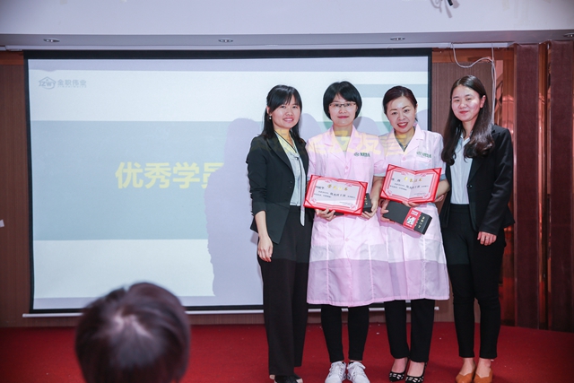学员分享结束后,进入颁奖环节。309期催乳师班获得“优秀班干部”的是班长盛薇和学习委员何丽华,获得“优秀学员”的是肖宇和王美玉。