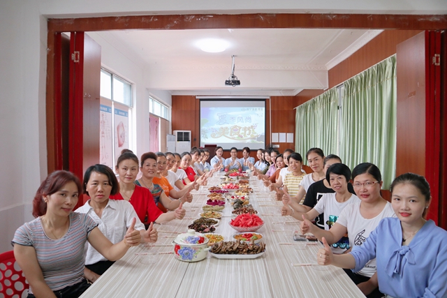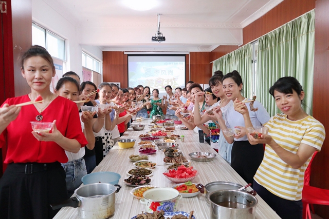 全体师生在学校教室一起分享各自带来的美食,欢度夏至。