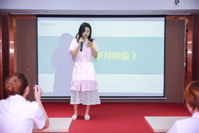 “时间是让人猝不及防的东西......”一开场,多才多艺的产后康复师班的学员便开始登台表演精心准备的节目。学员刘敏带来了一首陪伴自己度过大学迷茫时期的歌曲《岁月神偷》,她想把这首歌送给最真挚的朋友们,正如歌词中所说“岁月是一场有去无回的旅行。”她希望大家能够珍惜这段友谊,将这份真挚的情感铭记于心。